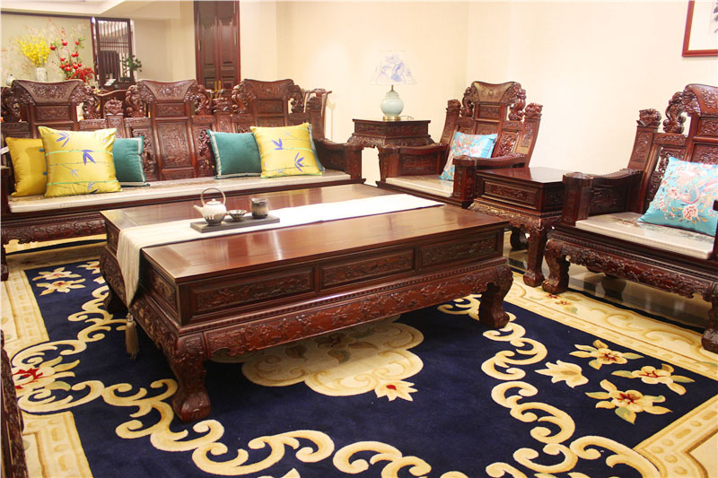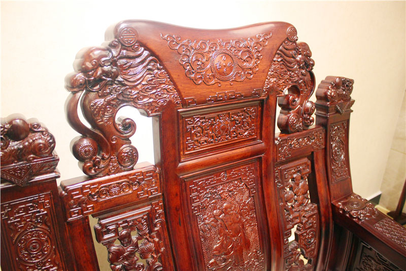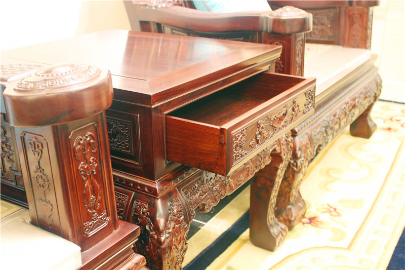 面板寬厚,精雕細(xì)刻,結(jié)構(gòu)流暢,家具整體霸氣而不失優(yōu)雅。