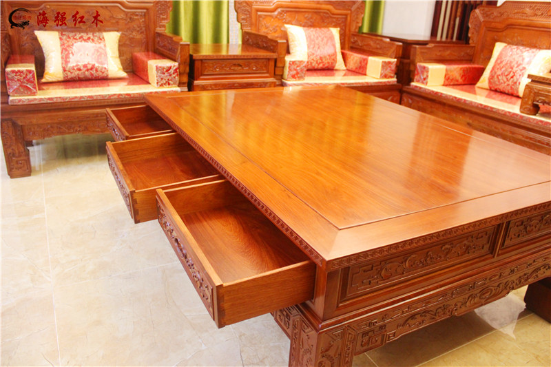 漢宮沙發(fā)的大茶幾,有6個(gè)抽屜都是可以打開的。