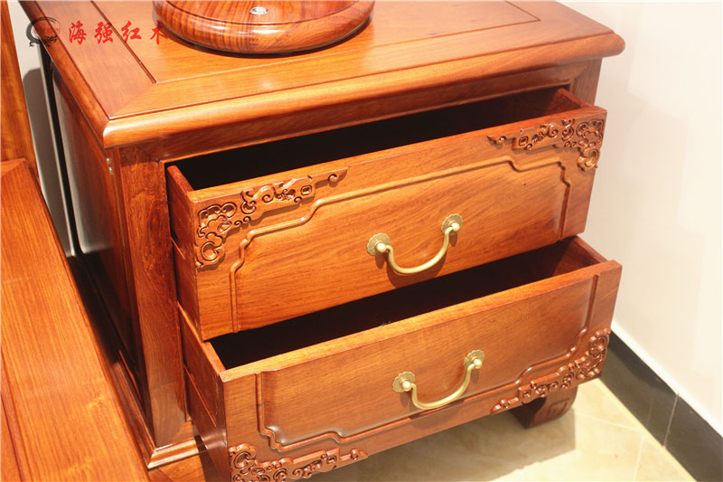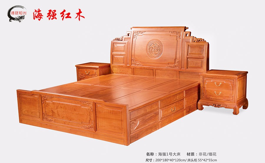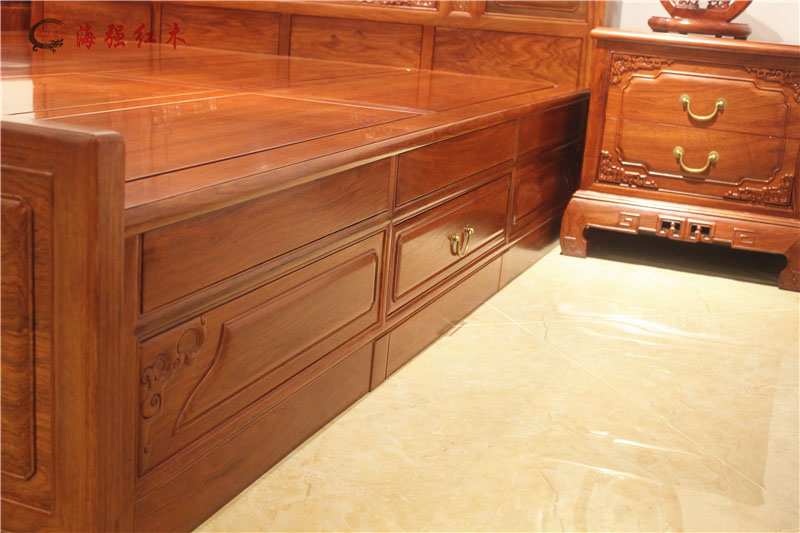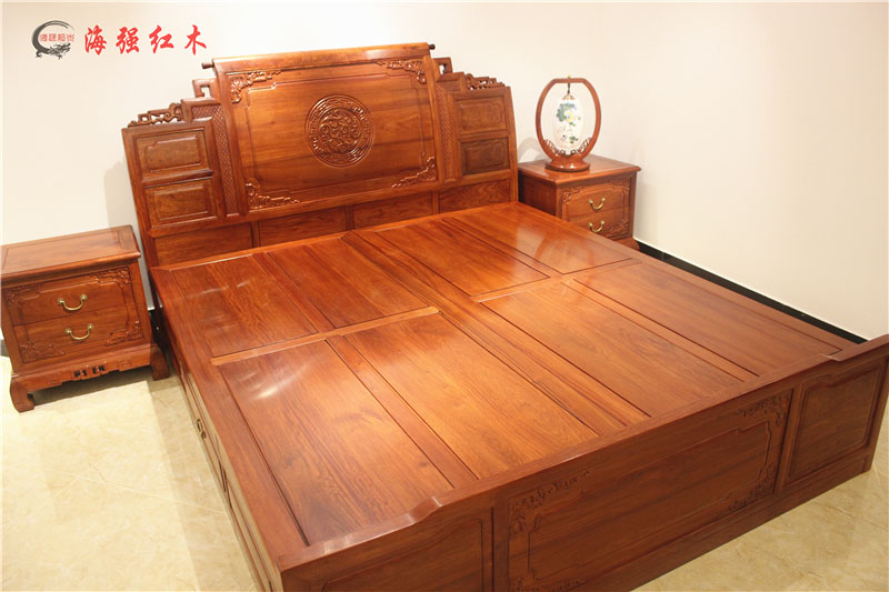 整套紅木大床實拍圖片:包括大床+兩個床頭柜。